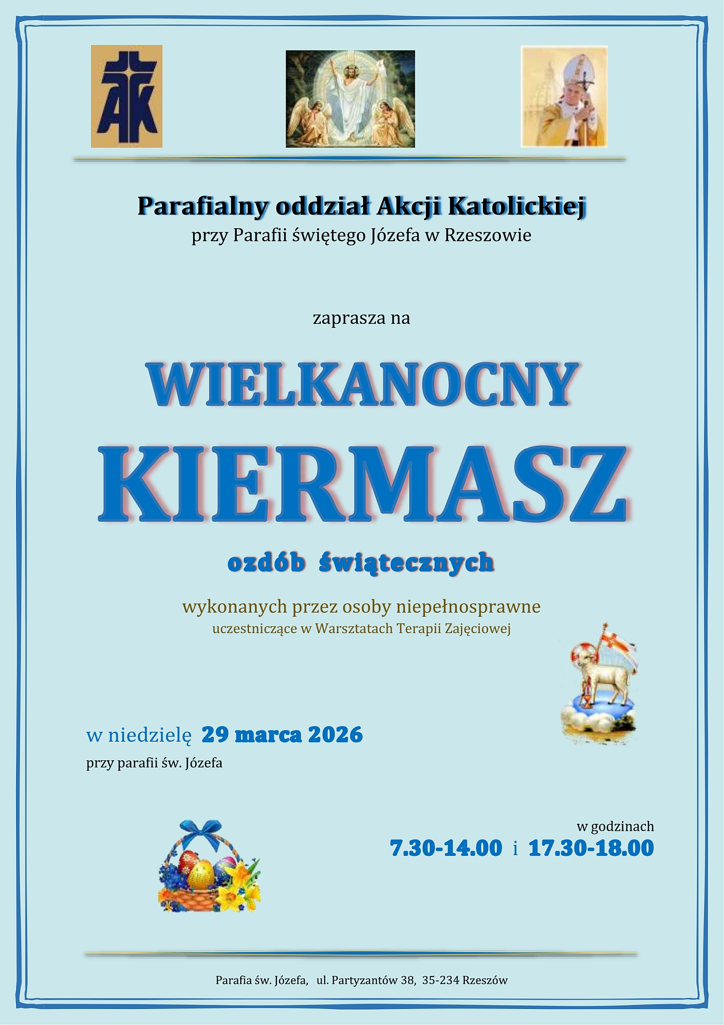 Błogosławieństwo pokarmów na stół wielkanocny z katechezą w następujących godzinach: 9:00, 9:30, 10:00, 10:30, 11:00, 11:30, 12:00, 12:30, 13:00 oraz o godz. 15:30 i 16:00