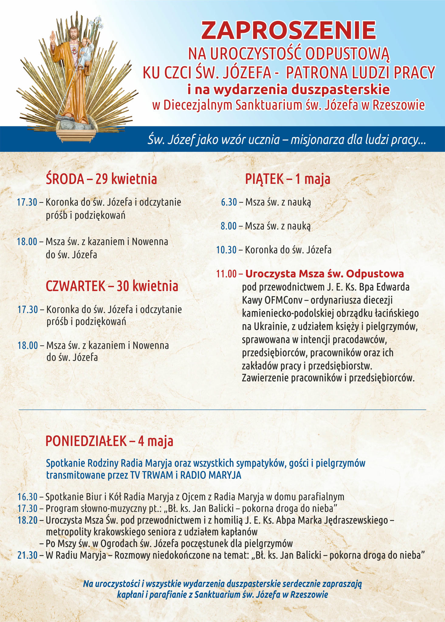 - Przygotowujemy się do uroczystości odpustowej ku czci św. Józefa – Patrona ludzi pracy w dniu 1 maja, głównej Mszy św. o godz. 11:00 będzie przewodniczył J. E. Ks. Bp Edward Kawa OFMConv – ordynariusz diecezji kamieniecko-podolskiej obrządku łacińskiego na Ukrainie. Na tę Mszę św. zapraszamy wszystkich ludzi pracy.